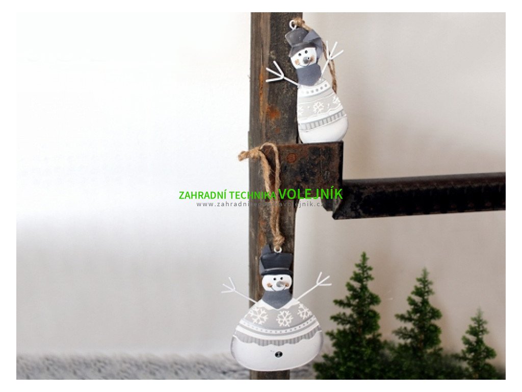 Sněhulák má na těle různé motivy, kolem krku šátek a místo nosu pevnou pružinku. Díky provázku jej můžete zavěsit.