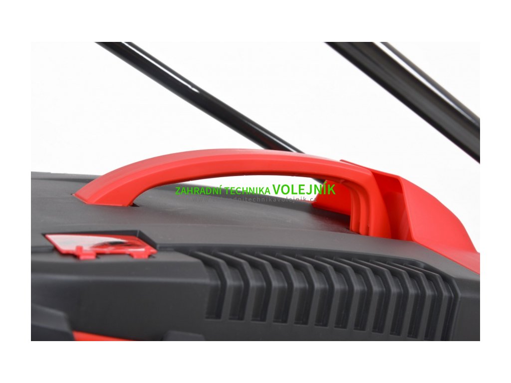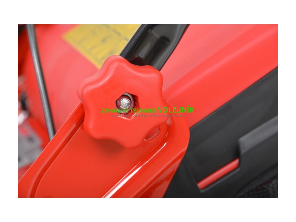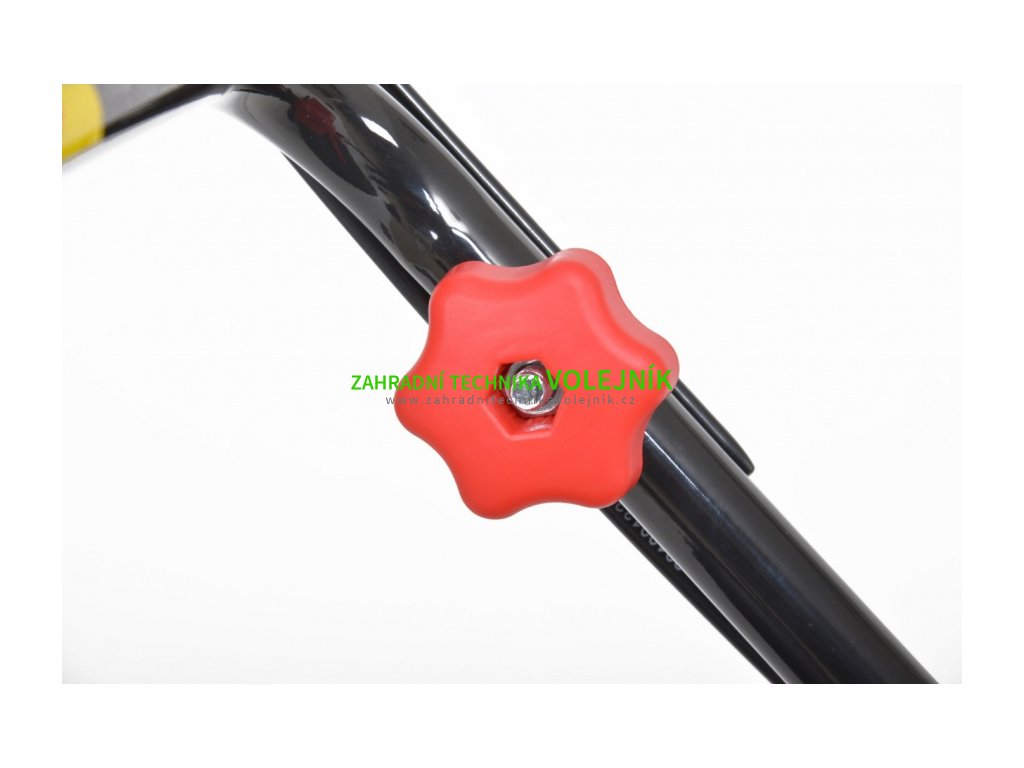 Kvalitní rukojeť lze díky použití hvězdicových matic kdykoli během pár vteřin snadno oddělit nebo složit. Zároveň je rukojeť opatřena propracovaným systémem nastavení výšky, který lze použít i pro její rychlé složení při parkování. Velkou výhodou je i páka spínače motoru a páka pojezdu, které jsou vedeny po celé šířce madla. Díky tomu je možné vést sekačku libovolnou rukou a druhou ruku využít například k bezpečné manipulaci s přívodním kabelem. Samozřejmostí je i bezpečnostní tlačítko proti náhodnému spuštění a odlehčovač pnutí kabelu.