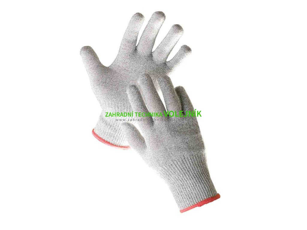 Pletené bezešvé rukavice z modifikovaného skleněného vlákna, Spandexu a nylonu, s odolností proti prořezu tř. 5.