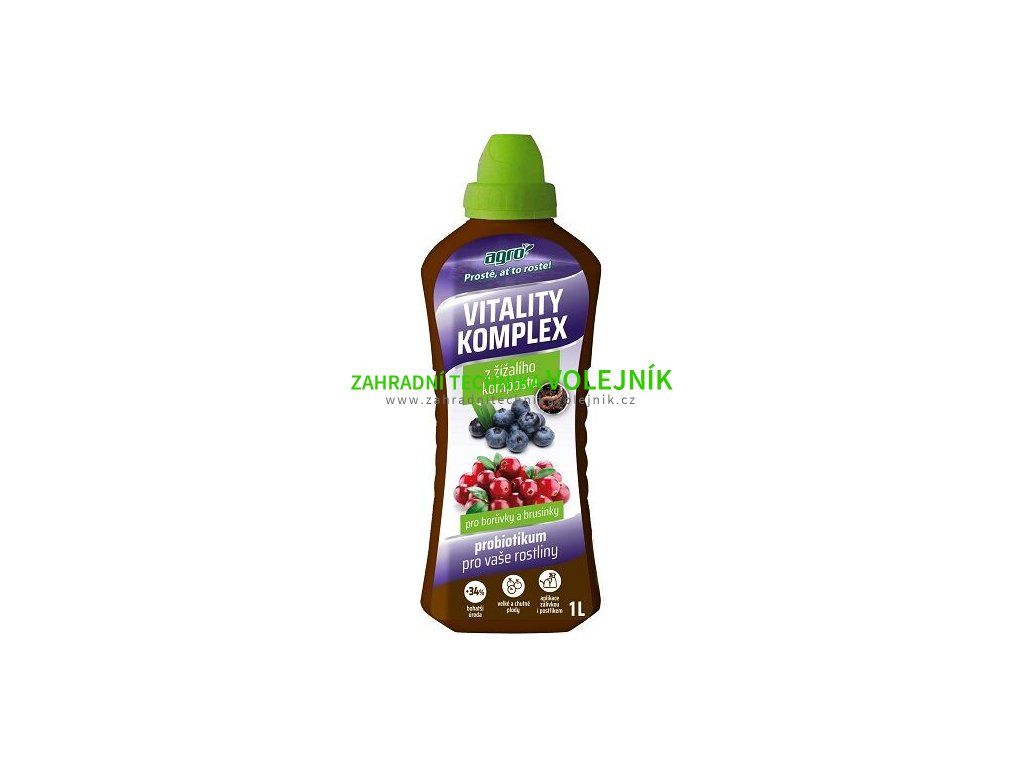 VITALITY KOMPLEX je výluh z vermikompostu (vzniká činností kalifornských žížal). Vedle živin a mikroprvků obsahuje tzv. urychlovač hnojení, který se používá k obnovení vitality a růstu rostlin, ke zvýšení odolnosti proti abiotickým stresům (sucho, přemokření apod.), urychluje regeneraci, stimuluje růst rostlin po poškození chorobami a škůdci. Zvláště vhodný je pro oslabené, nerostoucí a zanedbané rostliny. Humusové látky omezují únavu půdy a její vyčerpání.