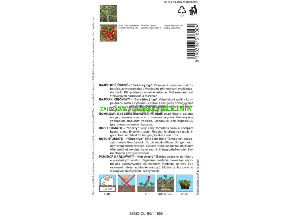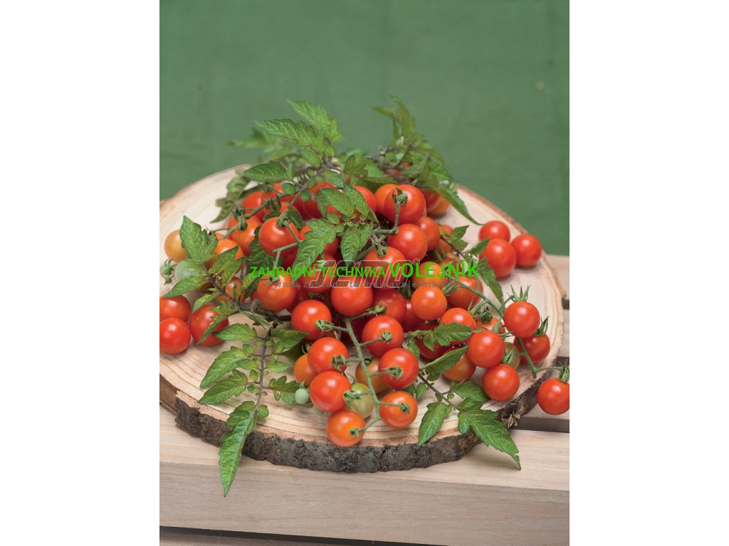 Velmi rané kompaktní keříčkové rajče s červenými kulatými třešňovými plody (15–20 gramů). Vhodné pro pěstování v závěsných nádobách.